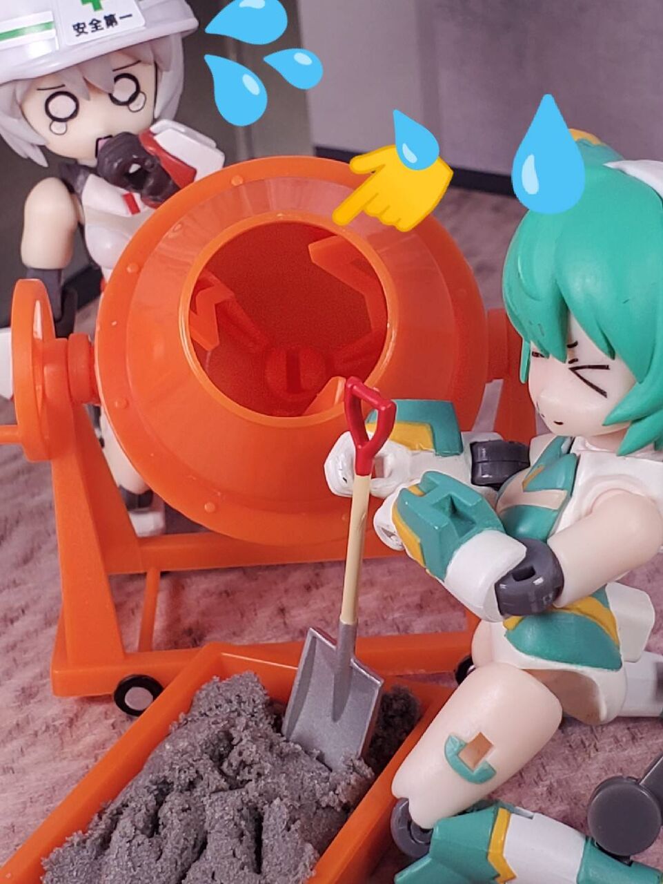 オレンジのコンクリートミキサーには「スコップ」と「コンクリートを混ぜるトレー」が付属