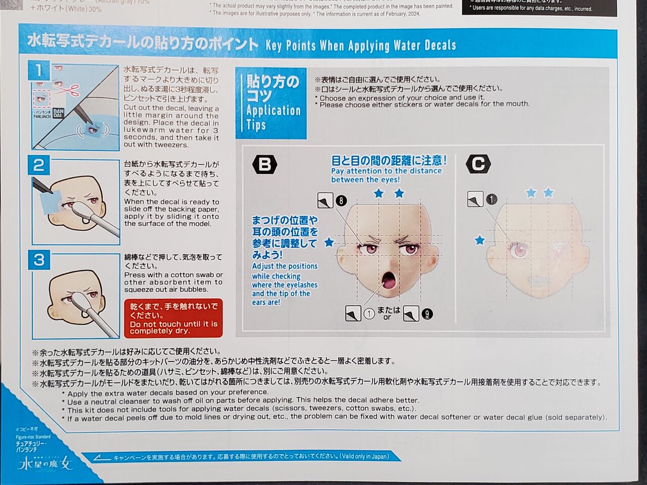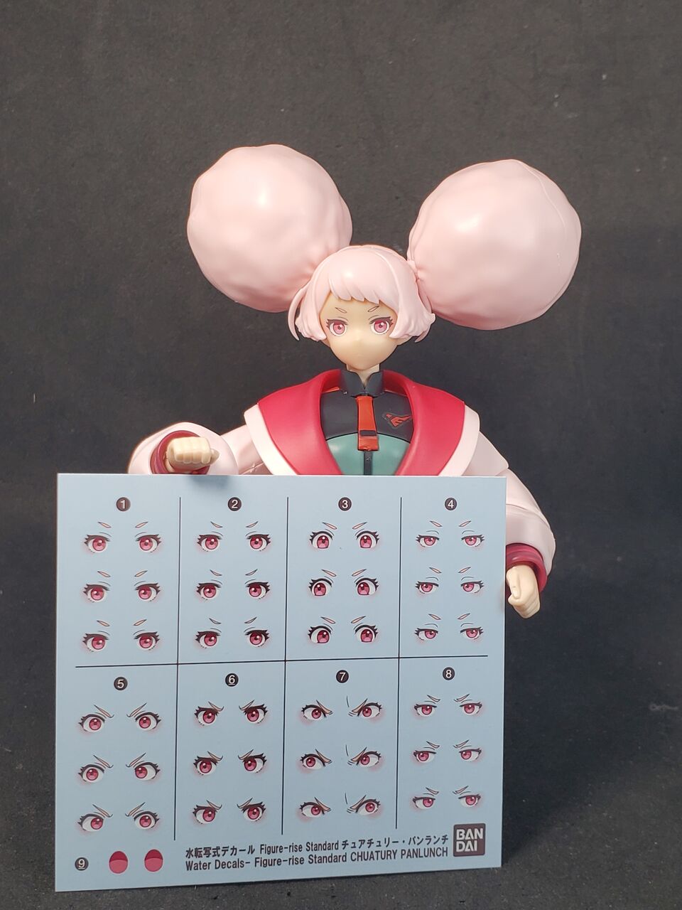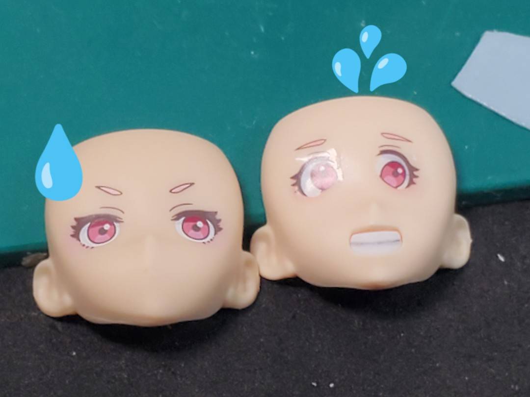 付属のフェイスパーツは1つは表情付きですが、残り2つはアイデカール(水転写デカール)を貼り付ける必要があります
