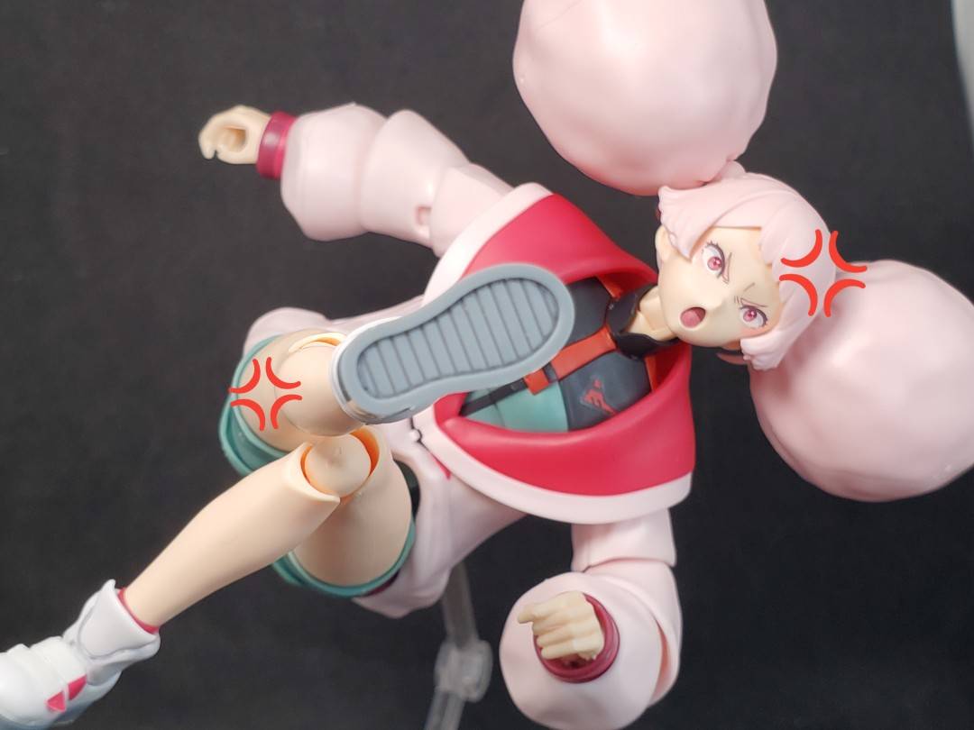 付属の展示用ベースと「しゃがみパーツ&座り込みパーツ」を使えば、飛び蹴りも可能です