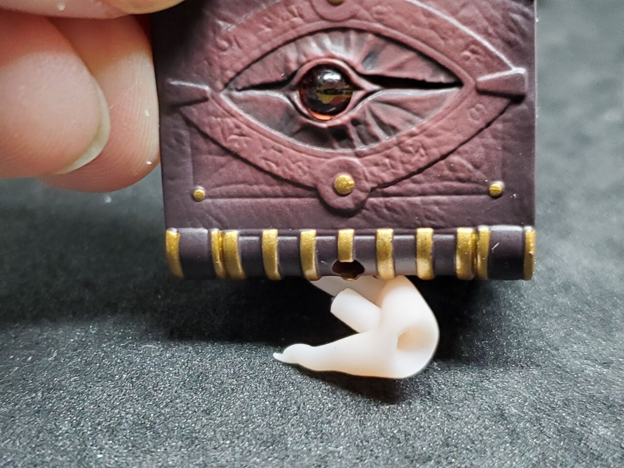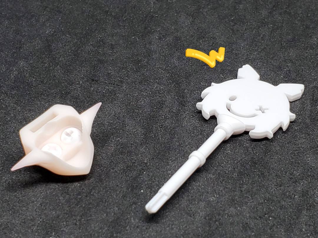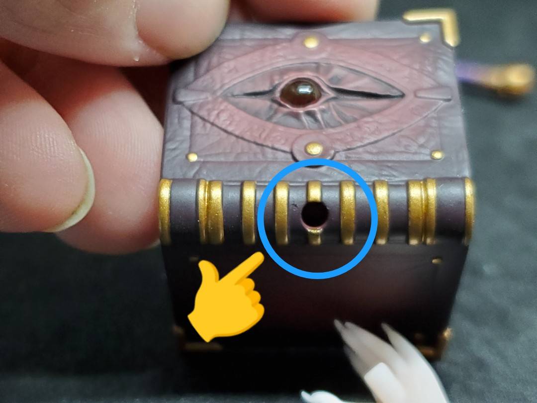 魔道書の背の部分に穴が開いてあて、「凸軸のあるハンドパーツ」を差し込む事で、手持ちが可能です