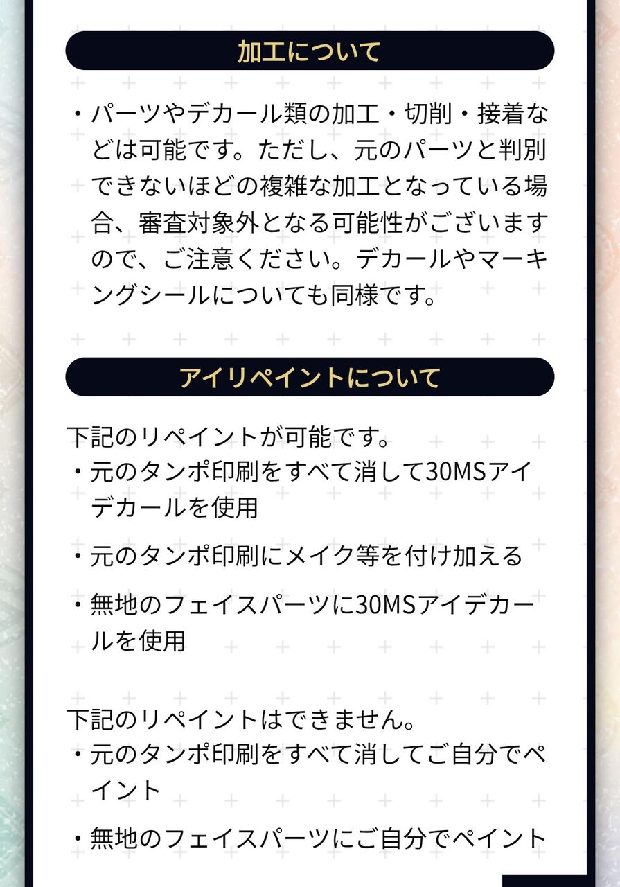 加工や、アイリペイントにも条件がありますので、こちらもご注意を