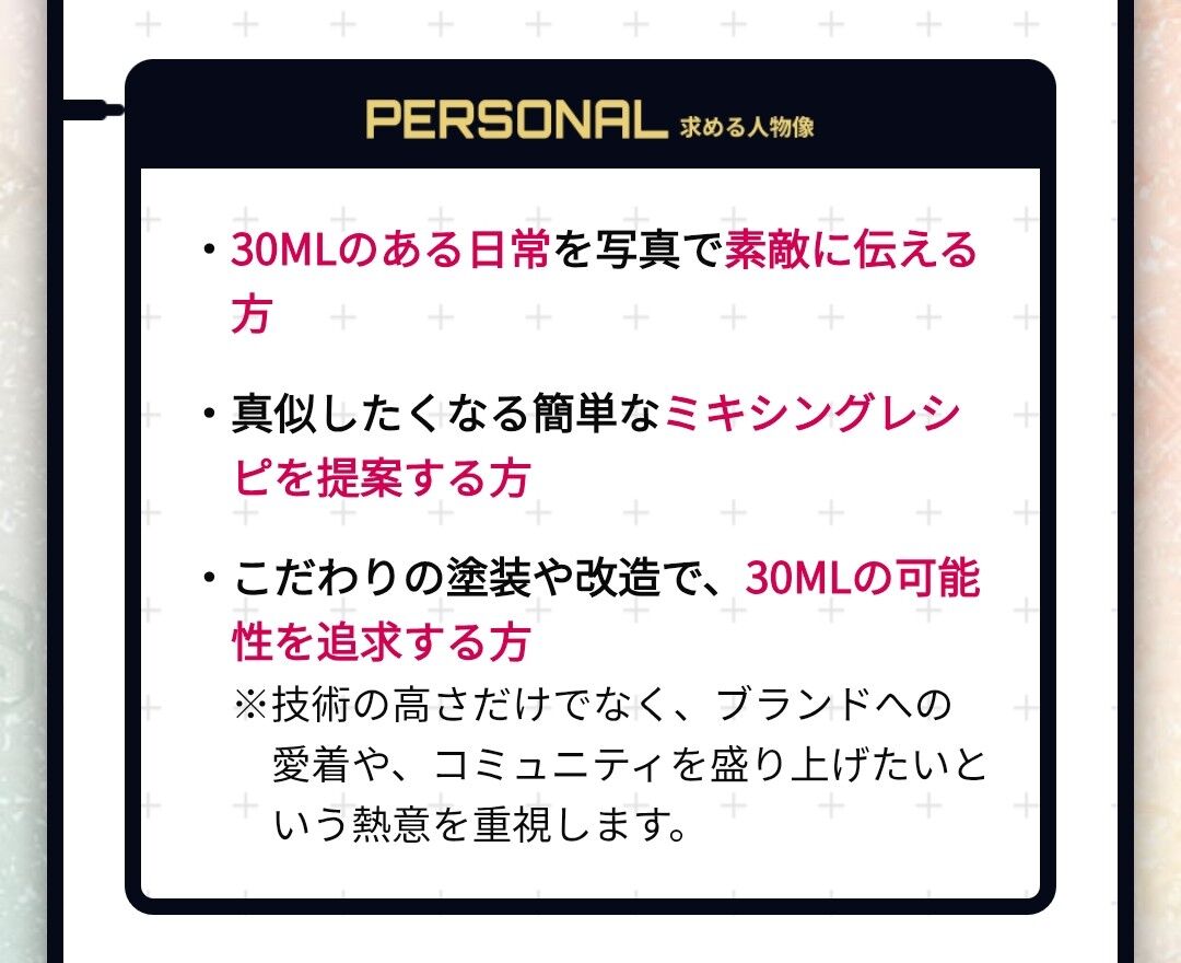 日頃から30MLシリーズで写真を投稿したり、真似したくなるミキシング作例を投稿されてる方が求められてます